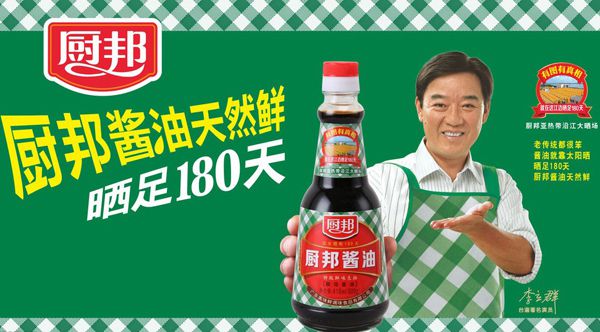 举例厨邦酱油。今天中国快消品酱油激烈竞争的市场,如果能够新做起一个全新的品牌,不是那么容易,这是硬弓硬马的活,不是可以侥幸的活。我们用什么方法让它迅速的成功呢?因为用了超级符号的方法。用了什么样的超级符号呢?大家都看到就是用了餐桌布的绿格子。用一个绿格子做它的包装的形象。这个符号有那么大的魔力吗?它就有那么大的魔力。为什么?人们本来不认识厨邦。但人人都认识餐桌布的绿格子,首先我要讲绿格子在商场里面的陈列,有巨大的视觉的优势。因为一