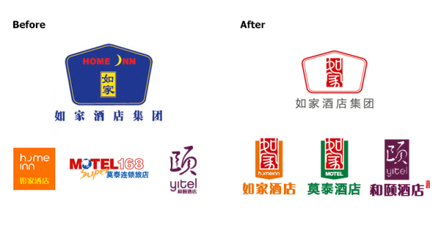 2014年3月30日,中国最大的连锁酒店业巨头如家酒店集团全面启用新标志,旗下三大酒店品牌如家酒店、莫泰酒店以及和颐酒店的标志也同步变更。新版如家酒店集团标志升级了此前黄蓝小屋的设计形象,采用了色调为中国红的印章设计方案,更加简洁流畅和现代利落。印章在中国传统文化中是权利与责任的象征,更是对诚信的一份郑重承诺,此次集团标志升级用深红线条和阴刻纹路组成汉字“如家”印,体现了如家集团在未来的发展中,始终以为消费者提供回家般 的服务为首任的责任与承诺;同时,将中国传统的印章和书法艺术形式结合起来,经过艺术的再创作,优雅地写出了如家一直倡导的人人相互支撑的”家”文化。