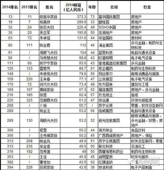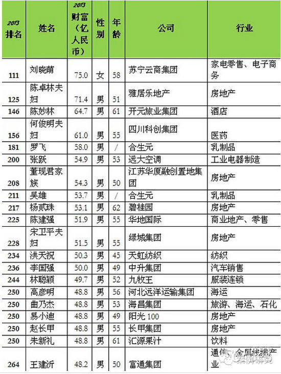 | 排名 | 姓名 | 财富(亿人民币) | 性别 | 年龄 |